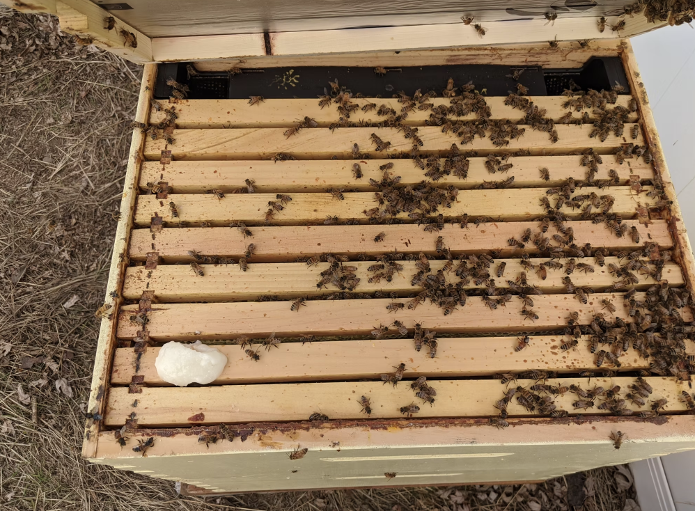 The Salve should be applied on the upper brood chamber and on top of a frame near one of the corners of the hive. If you have a frame feeder then apply opposite side of hive near one of the two corners. Take your hive tool or spoon and scoop 1 oz. of the salve and place directly on top of frame. Not between frames. If you are replacing the salve and some is still left on the frame, then just scrape off and apply new.